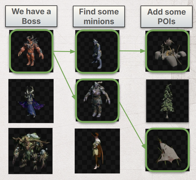 For example, if our boss is a Kratch Hill Chewer, its minions should also be Kratch, and nearby landmarks and points of interest should also give a Kratch vibe.