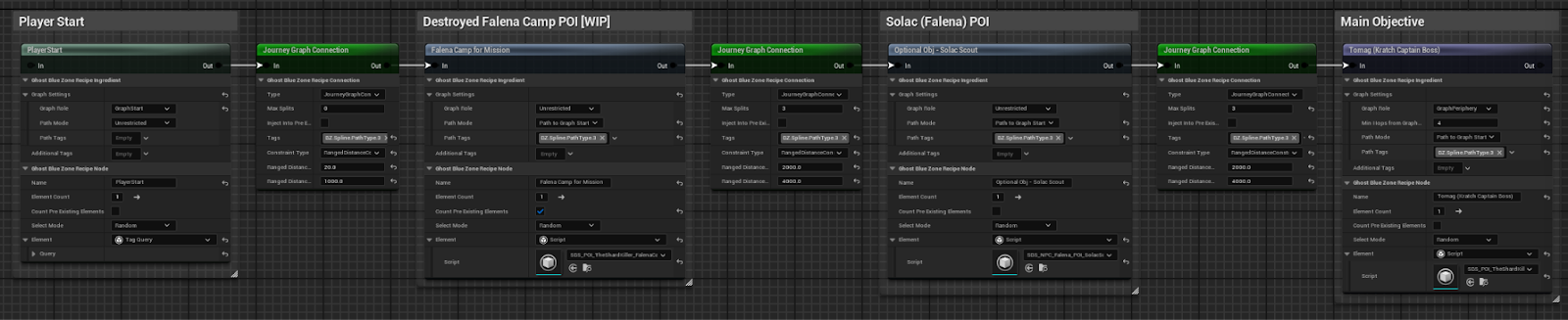 Our solution was to build a visual editor to let designers define the core journey for any particular Blue Zone: where the player starts, the key narrative beats in the mission, the final objective, and most importantly, how they connect to each other.